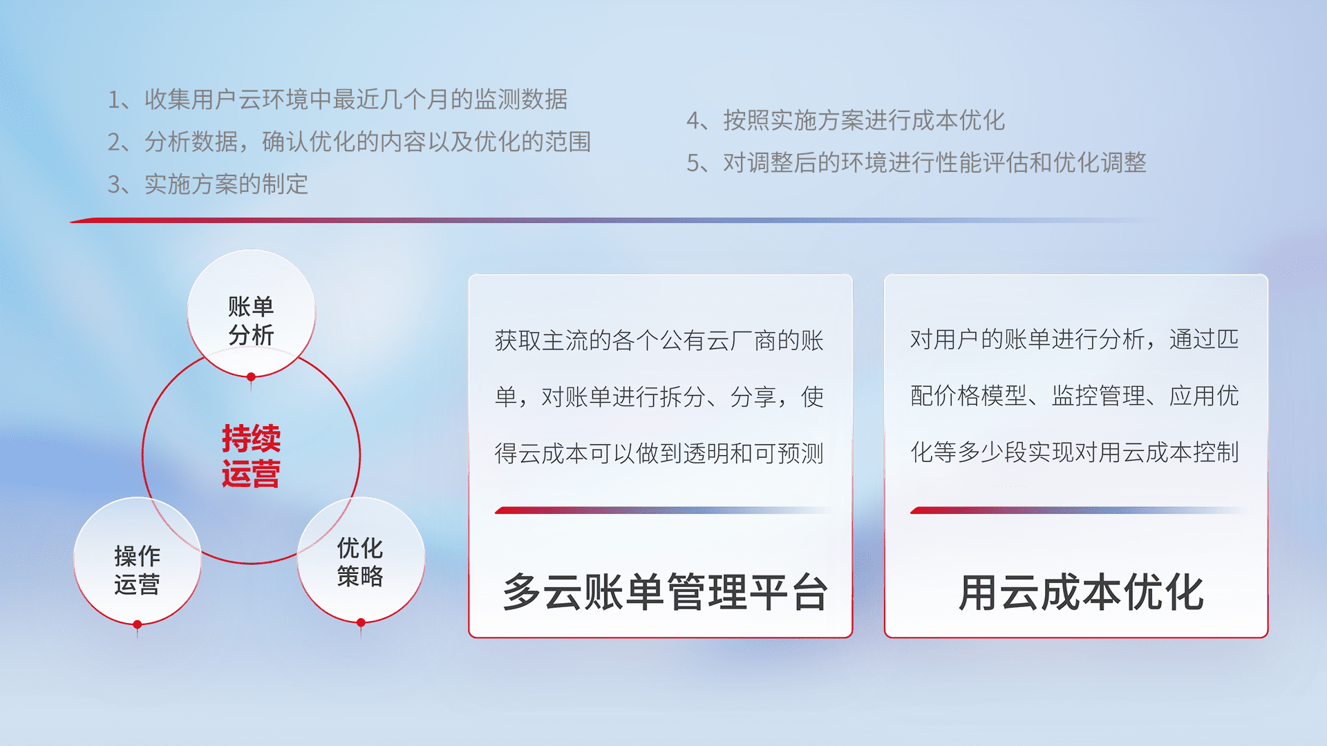 通过多云纳管,,,以统一的资源数据模型把客户的云资源进行抽象和封装,,进而实现对多云资源的统一操作,,,保障云资源管理的可靠性、、稳定性与可用性。。量身定制化运维内容,,,配置、、、开发运维、、、补丁管理、、、备份、、监控、、、、认证和访问管理、、、审计和日常巡检等,,,,保障在用云过程中的可靠度,,,,稳定度以及高可用率。。